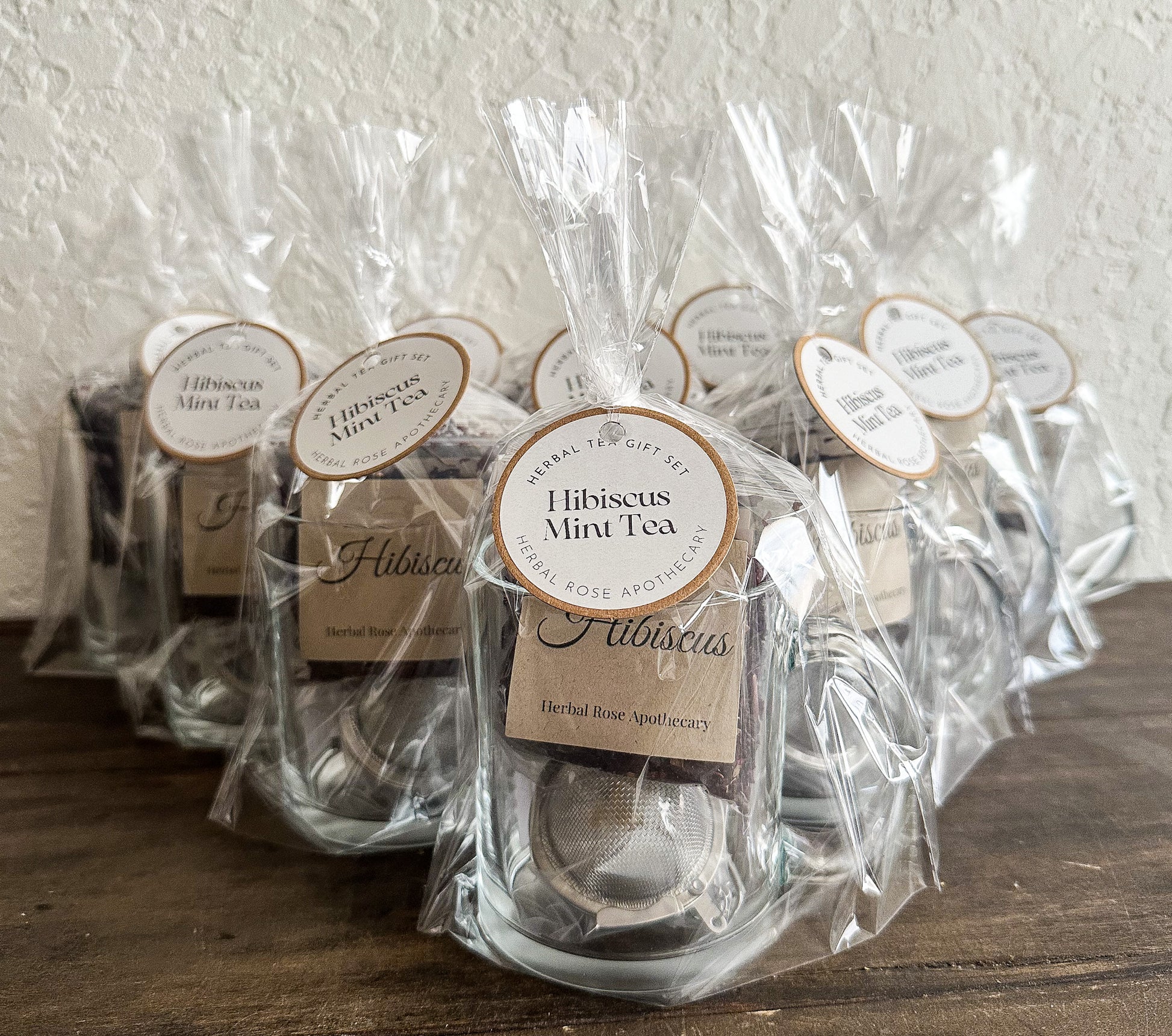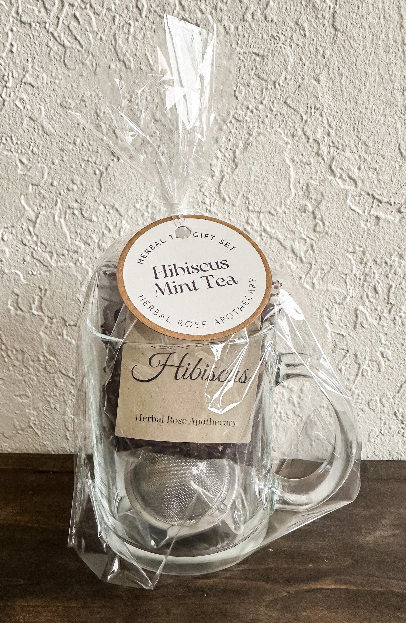 Gift set comes in a glass mug with tea ball infuser, 0.5oz hibiscus, 8g peppermint, and 2 honey packs. Directions included. Makes 8 servings.